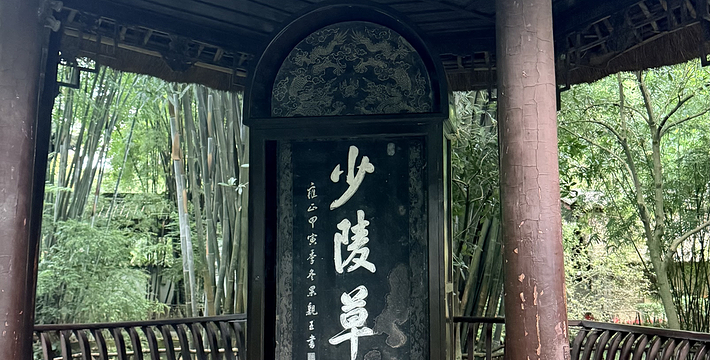 它是一座以茅草作顶的亭子,内树有一石碑,镌刻“少陵草堂”四个大字,笔力浑厚,笔姿秀润,是果亲王允礼所书。