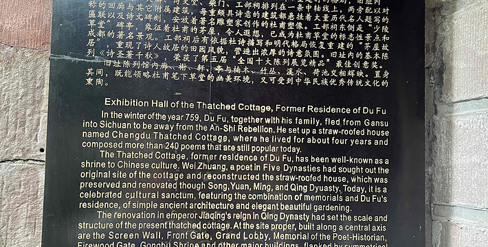 成都杜甫草堂是诗圣杜甫流寓成都时的故居。从公元759年至公元765年杜甫先后在此居住三年零九个月,创作诗歌有240余首留传至今,成都草堂由此被誉为“中国文学的圣地”。自五代至宋、元、明、清,历经十三次大规模修葺扩建和建国以来数十年的保护发展,衍变为建筑古朴典雅,园林秀丽清幽的文化名胜。