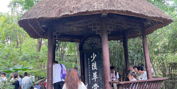 它是一座以茅草作顶的亭子,内树有一石碑,镌刻“少陵草堂”四个大字,笔力浑厚,笔姿秀润,是果亲王允礼所书。