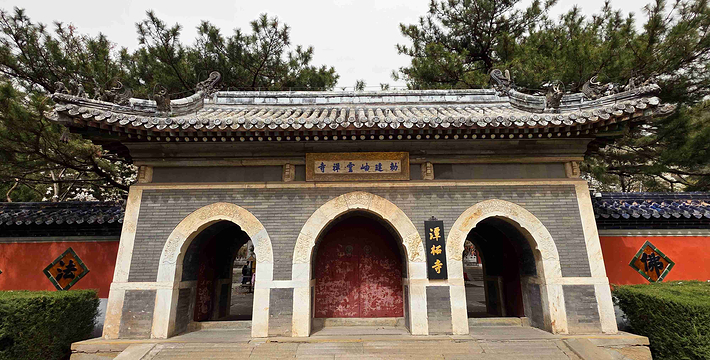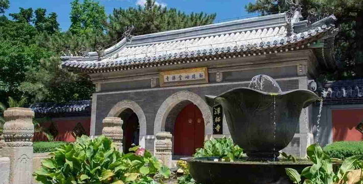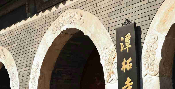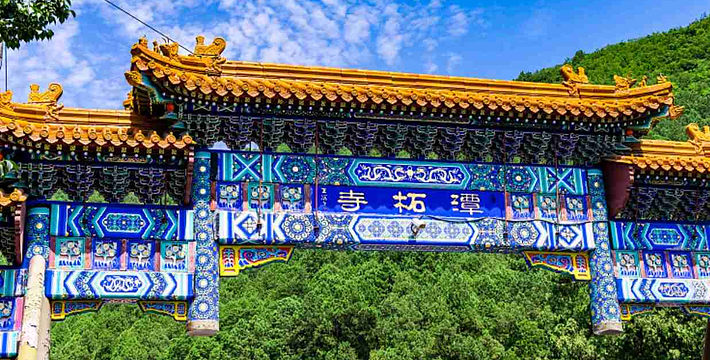 潭柘寺位于北京西郊门头沟区东南部的潭柘山麓,距阜成门41公里。潭柘寺坐北朝南,背倚宝珠峰,周围有九座高大的山峰呈马蹄状环护,这九座山峰从东边数起依次为回龙峰、虎距峰、捧日峰、紫翠峰、集云峰、璎珞峰、架月峰、象王峰和莲花峰,九座山峰宛如九条巨龙拱卫着中间的宝珠峰,规模宏大的潭柘寺古刹就建在宝珠峰的南麓。高大的山峰挡住了从西北方袭来的寒流,使潭柘寺所在之处形成了一个温暖、湿润的小气候,因而这里植被繁茂,古树名花数量众多,自然环景极为优美。潭柘寺规模宏大,寺内占地2.5公顷,寺外占地11.2公顷,再加上周围由潭柘寺所管辖的森林和山场,总面积达121公顷以上。殿堂随山势高低而建,错落有致。北京城里的故宫有房9999间半,潭柘寺在鼎盛时期的清代有房999间半,俨然是故宫的缩影,据说明朝初年修建紫禁城时,就是仿照潭柘寺而建成的。潭柘寺始建于西晋,至今已有近1700年的历史,在北京民间有“先有潭柘,后有幽州”的谚语。潭柘寺在晋代时名叫嘉福寺,唐代时改称龙泉寺,金代御赐寺名为大万寿寺,在明代又先后恢复了龙泉寺和嘉福寺的旧称,清代康熙皇帝赐名为岫云寺,但因其寺后有龙潭,山上有柘树,故而民间一直称其“潭柘寺”。潭拓寺坐北朝南,主要建筑可分为中、东、西三路。寺庙背倚宝珠峰,周围有九坐高大的山峰呈马蹄状环护。山峰挡住了从西北方袭来的寒流,使潭柘寺所在之处形成了一个温暖、湿润的小气候,因而这里植被繁茂,古树名花数量众多。潭拓寺建筑保持着明清时期的风貌。这里古迹文物众多,镀金鸱带、金代诗碣、清代肉身佛,神奇的石鱼都是难得一见的文物珍品。