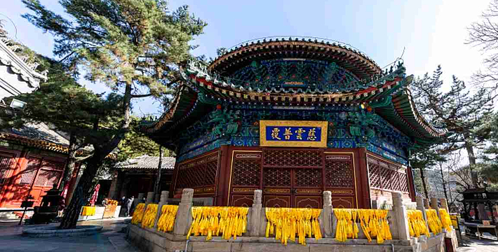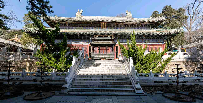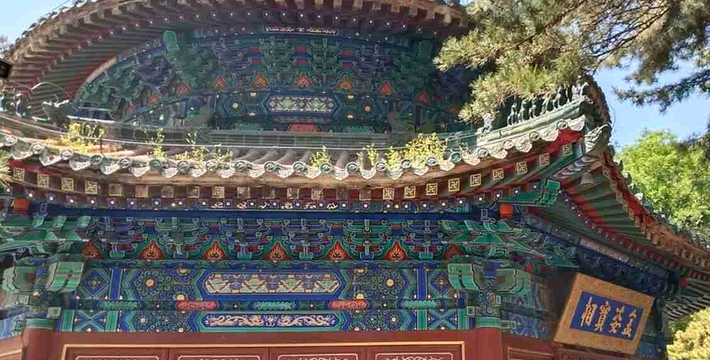 大雄宝殿面阔五间,重檐庑殿顶,黄琉璃瓦绿剪边,上檐额题“清静庄严”,下檐额题“福海珠轮”。