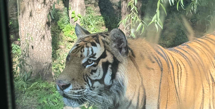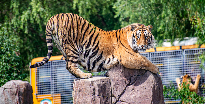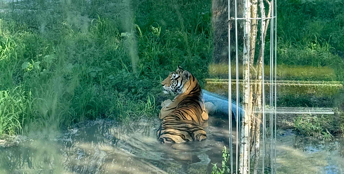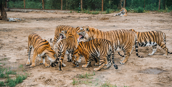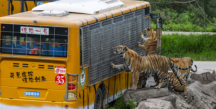 成虎园36万平方米,散放着30只野性猛虎,游人可以乘专用旅游车漫游于群虎之间。