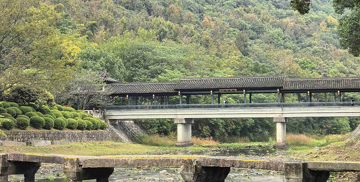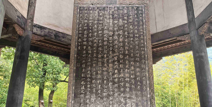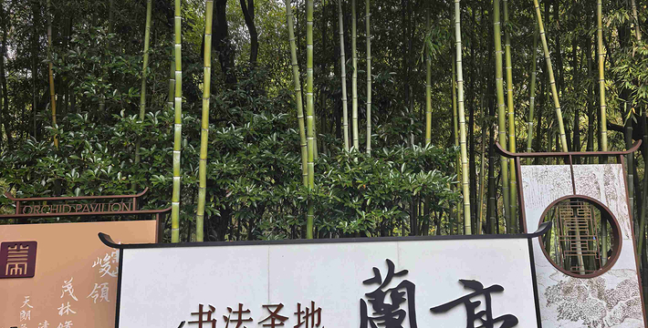 兰亭位于绍兴市西南十四公里处的兰渚山下,是东晋著名书法家王羲之的寄居处,这一带有“崇山峻岭,茂林修竹,又有清流激湍,映带左右”,是山阴路上的风景佳丽之处。相传春秋时越王勾践曾在此植兰,汉时设驿亭,故名兰亭。现址为明嘉靖二十七年(公元1548年)郡守沈启重建,几经反复,于1980年全面修复如初。兰亭布局以曲水流觞为中心,四周环绕着鹅池、鹅池亭、流觞亭、小兰亭、玉碑亭、墨华亭、右军祠等。鹅池用地规划优美而富变化,四周绿意盎然,池内常见鹅只成群,悠游自在。鹅池亭为一三角亭,内有一石碑,上刻“鹅池”二字,“鹅”字铁划银钩,传为王羲之亲书;“池”字则是其子王献之补写。一碑二字,父子合璧,乡人传为美谈。流觞亭就是王羲之与友人吟咏作诗,完成《兰亭集序》的地方。东晋穆帝永和九年三月三日,王羲之和当时名士孙统、孙绰、谢安、支遁等41人,为过“修禊日”宴集于此,列坐于曲水两侧,将酒觞置于清流之上,飘流至谁的前面,谁就即兴赋诗,否则罚酒三觞。这次聚会有26人作诗37首。王羲之为之作了一篇324字的序文”之称的王羲之书法代表作《兰亭集序》。兰亭也因此成为历代书法家的朝圣之地和江南著名园林。