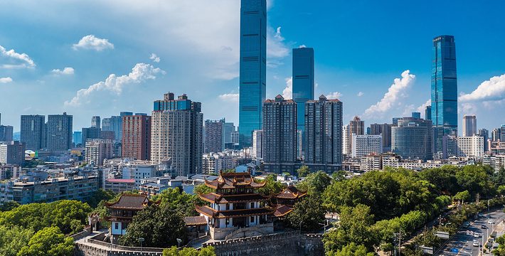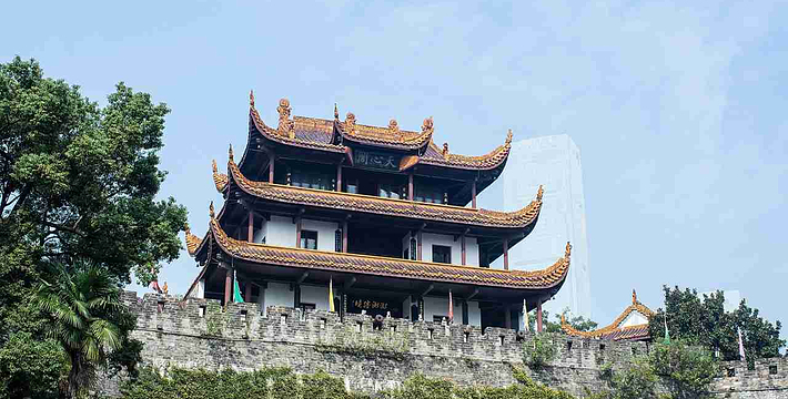 天心阁是长沙重要名胜,也是长沙仅存的古城标志。位于长沙市中心东南角、城南路与天心路交会之处的古城墙内。楼阁三层,建筑面积846平方米,碧瓦飞檐,朱梁画栋,阁与古城墙及天心公园其它建筑巧妙融为一体,加之坐落在30多米高的城垣之上,近有妙高峰为伴,远望岳麓山为屏,更显挺峭、峻美。登上天心阁,长沙城全景一览无余,远望湘江,真有“极目楚天舒”的心旷神怡之感。楼阁建于明代,重修于清乾隆时期,1938年毁于“文夕大火”,1983年再修。再修后的楼阁既保持了主阁的原貌,又参照古岳阳楼,增建了两座二层的辅阁,象鹏鸟的主体和两翼。三阁以通廊相连接,浑为一体,使矗立于32米高的锥垛之上的古阁,更加壮观。阁楼高17.5米,用60根木柱支撑,主辅阁饰以用花岗石和其他高级石料雕凿的狮子、葫芦头、梅、竹、芙蓉、车、马、龙等。檐上32个高啄鳌头,32只凤马铜铃和10条吻龙,也都古色古香,造型别致。今日天心阁,已成为城南的一座新型公园。内有摄影、饮食、茶点、副食和工艺品等旅游服务设施。园内堆砌有假山、凉亭、鱼池,园内树木繁茂,花草众多。每天有很多人到此练*、读书、游览、品茗。