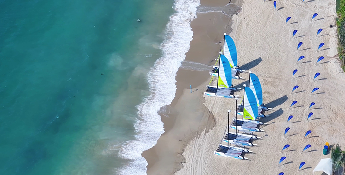 黄金海滩,柔软细沙,椰林树影,浪花徘徊。