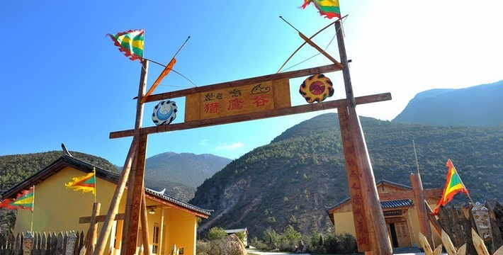 猎鹰谷景区毗邻丽江古城、束河古镇,以及东巴文化发祥地——白沙。谷内幽险峻美,溪水潺潺;谷口与遐迩文明的玉龙雪山相对应,自然纯朴,山水相依,风景秀丽,是独具特色鹰猎文化特色的风水宝地。猎鹰谷视野辽阔,绿草如茵,高山草甸和鬼斧神工的地震大裂谷都在猎鹰谷视野下。