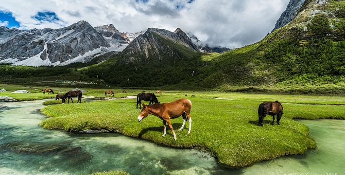 洛绒牛场位于四川省甘孜藏族自治州稻城县境内,海拔4150米,是附近村民放牧的高山牧场,成群的牛羊在这里享受着充足的阳光、青青的草地和纯净的湖水。