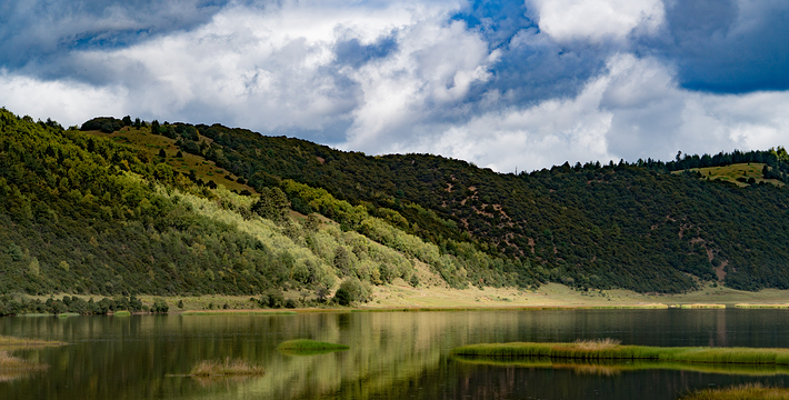 草场四周青山入云,原始森林遮天蔽日,有许多粗大的杉木,空气清新,环境恬静幽雅;林中栖息着麝、熊、云豹、金猫、猞猁、毛冠鹿、藏马鸡等许多珍禽异兽。