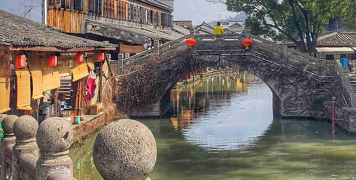 老街依河而建,河之南为民居,河之北是商市,两岸之间古桥相连。